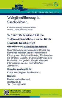 Saarhölzbach ist ein besonderer Ortsteil der Gemeinde Mettlach. Bei der kostenlosen Führung zum Weltgästeführertag 2024 werden die Straßen, Gassen und Brücken des Dorfes ins Licht gerückt. Es gibt allerhand Interessantes aus der Heimatdorf der ‚Binnessen'.