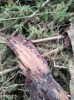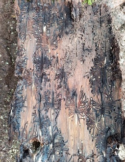 Abbildung 1: Fraßbild des Borkenkäfers unter der Rinde führt zum Absterben der Bäume - zeitgleich grüne Äste