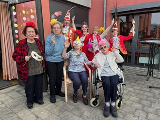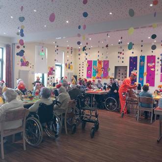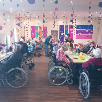 Gestartet wurde schon früh am Fetten Donnerstag. Die närrische Schar an Heimbewohner*innen und Mitarbeiter*innen versammelten sich zu einem gemeinsamen Frühstückbuffet im bunt geschmückten Speisesaal. Es bot sich ein farbenfrohes Bild, denn die Mitarbeitenden des Alten- und Pflegeheims hatten sich alle verkleidet. Ein bunter Mix aus Marienkäfern, Bienen, wilden Tieren und viele weiteren lustigen Kostümen kamen zusammen. Die gesamte Bewohnerschaft trug den im Vorfeld selbstgebastelten Kopfschmuck und Fastnachtsmusik sorgte für ausgelassene Stimmung im Saal.