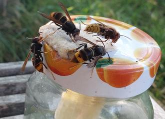 Seit einigen Tagen haben die ersten Königinnen der Asiatischen Hornisse ihr Winterquartier verlassen und machen sich auf die Suche nach einem geeigneten Nistplatz. Um genügend Energie dafür zu tanken, suchen sie blühende Sträucher und andere Kohlenhydrat-haltige Nahrungsquellen auf. Diesen Hunger nach Süßem machen wir uns zunutze, indem wir sogenannte Locktöpfe oder Dochtgläser aufstellen, an denen die Königinnen gerne Energie tanken - und beobachtet werden können.
