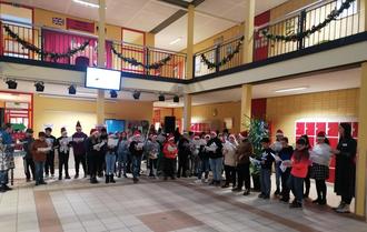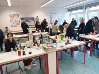 Die Klassen 10a und 10b führten unsere Besucher auf Wunsch durch die beiden Gebäude und standen für Fragen zur Verfügung. Es gab die Möglichkeit, sich in der Sporthalle beispielsweise beim Tischtennis körperlich zu betätigen oder im Chemiesaal zu experimentieren. Prinzipiell standen aber alle Türen offen und man durfte überall reinschauen und auf Wunsch mitmachen. Darüber hinaus wurden Schaukästen zu Balladen gebastelt, Lapbooks zum Thema Weihnachten erstellt, Schach gespielt, Tänze einstudiert, Poster gestaltet und es gab verschiedene kulinarische Angebote wie Tee oder Kuchen und Kaffee.