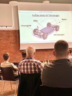 Im Anschluss wurde das Thema Elektromobilität behandelt, das angesichts der zunehmenden Verbreitung von Elektrofahrzeugen immer relevanter wird. Die Kameraden informierten die Teilnehmer über die speziellen Gefahren, die bei Verkehrsunfällen mit Hochvoltfahrzeugen auftreten können, sowie über die entsprechenden Sicherheitsvorkehrungen.