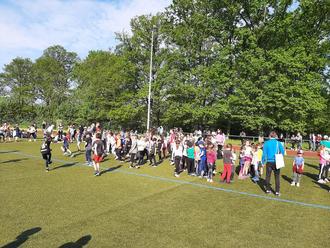 Hochmotiviert traten dann unsere über zweihundert jungen Sportler in den Disziplinen 50-m-Lauf, Weitwurf, Weitsprung, sowie den Lang-streckenläufen an, nachdem sie sich mittels eines Zumba-Workouts tüchtig aufgewärmt hatten.