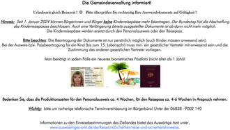 Hinweis: Seit 1. Januar 2024 können Bürgerinnen und Bürger keine Kinderreisepässe mehr beantragen. Der Bundestag hat die Abschaffung des Kinderreisepasses beschlossen. Auch eine Verlängerung bereits ausgestellter Dokumente ist ab dann nicht mehr möglich. Die Kinderreisepässe werden ersetzt durch den Personalausweis oder den Reisepass.