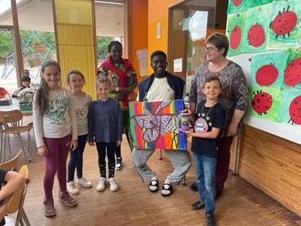 Einen tollen Überraschungsgast durften die Kinder mittwochs bei der „Kulinarischen Reise um die Welt“ begrüßen. Nachdem alle bei den verschiedenen Ländern fleißig gekocht und gebacken hatten (an der Station Belgien gab es belgische Waffeln, in Spanien leckere Kartoffeltortillas, in der Türkei Döner usw.) stand nachmittags Ariel mit seiner Familie aus Afrika in der OGS. Er bedankte sich mit leckeren Bananenchips bei den Kindern für die Spende für seine OP. Die Kinder der Musik AG, unter der Leitung von Julian Klensch, sammelten beim Schulfest hierfür 85 €.