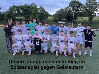 Am darauffolgenden Mittwoch empfingen wir zum Spitzenspiel den Tabellenzweiten aus Geislautern. Vor einer beachtlichen Kulisse zeigte unsere Mannschaft sich dann an diesem Abend von ihrer Schokoladenseite. Taktisch hervorragend von den Trainern eingestellt, zeigten wir von Beginn an, wer hier als Sieger den Platz verlassen wollte. Jeder einzelne Spieler im gesamten Kader rief seine bestmögliche Leistung ab. Wenn doch einmal ein Zweikampf verloren ging, wurde dies von einem Mitspieler wettgemacht. Aufgrund der hohen Laufbereitschaft unserer Offensiv- und Mittelfeldspieler wurden die Räume für den Gegner so eng gemacht, dass dieser sich nur noch mit langen Bällen zu helfen wusste, die von unseren Verteidigern gekonnt wegverteidigt wurden. Aber auch spielerisch wurde den Zuschauern eine sehr ansprechende Leistung mit tollen Kombinationen geboten. Alles in allem ein überzeugendes und „erwachsenes“ Auftreten unserer Mannschaft, das mit einem 3:0 Heimsieg belohnt wurde.