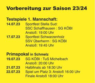 Die Vorbereitung auf die neue Saison ist in vollem Gange, und auch über diverse Testspiele erarbeitet sich unser Team (1., 2., 3. Mannschaft) die nötige Fitness. Auf dem Programm steht nun auch der diesjährige Primspokal in Schmelz, an dem unsere Erste antritt. Den Pokal könnten wir mal wieder mitnehmen, wäre doch ein guter Einstieg in die Saison.