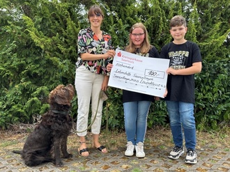 Herr Markus Roos kümmerte sich anschließend um die Spendenübergabe, bei der die beiden Schüler Alerio Amore und Maya Roos stellvertretend im Namen der Löwenklasse 4.2 den symbolischen Scheck im Wert von rund 100 € an Frau Esther Pyroth, der Geschäftsführerin für Jugend und Familie und Kinder gGmbH Lebenshilfe Saarlouis überreichten.