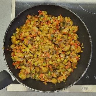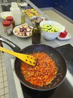 In der Gemeinschaftsküche der Litermonthalle (Nalbach) fand sich die Gruppe zusammen und durfte dankenswerterweise die Küchenausstattung der Jugendbetreuung der Gemeinde Nalbach nutzen. Unter der Leitung von Herrn Küpper kochten die Teilnehmer ein leckeres 2-Gänge-Menü. Als Vorspeise wurden rote und gelbe Beete sowie verschiedenen Möhrensorten in feine Scheiben geschnitten, verfeinert mit zerdrückten Walnüssen und verschiedenen Ölen wurde ein buntes Carpaccio zubereitet. Für den Hauptgang konnten die Teilnehmer fleißig schnippeln. Es gab ein Gemüse-Risotto bestehend aus Auberginen, Paprika, Tomaten, Zucchini, Zwiebeln und Zartweizen.