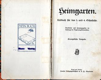 Durch Reg. Verf. v. 18.1.23. No A82 wird das im Auftrag der Regierungskommission herausgegebene Lesebuch für das 3. und 4. Schuljahr „Heimgarten“ von Ostern ab in allen Volksschulen eingeführt und zwar in einer katholischen und evangelischen Ausgabe. Die Einführung kann auch sofort geschehen, wo besondere Umstände es notwendig erscheinen lassen.