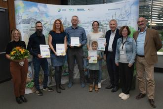 Die Gewinnerinnen und Gewinner des 36. Kreisumweltpreises umrahmt von der Juryvorsitzenden Claudia Beck (1.v.l.), Landrat Patrik Lauer (7.v.l.), Monika Lambert-Debong (Sachgebietsleitung Umwelt) (8.v.l.) sowie Dieter Ruck (Amtsleiter für Klimaschutz, Umwelt, Regionalentwicklung und Tourismus) (9.v.l.).