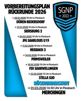 Nach einer etwas holprigen Hinrunde, die derzeit den 13. Tabellenplatz in der Bezirksliga Merzig-Wadern bedeutet, richtet die SGNP den Blick entschlossen nach vorne. In der Wintervorbereitung stehen mehrere Testspiele in Piesbach auf dem Programm, um Abläufe zu festigen und neues Selbstvertrauen aufzubauen. Mannschaft und Trainerteam arbeiten konzentriert daran, Fehler der Vorrunde aufzuarbeiten und in der Rückrunde stabilere Leistungen zu zeigen. Der Rückrundenstart erfolgt am 01.03.2026 in Piesbach gegen Merchingen. Zuschauer sind zu allen Spielen herzlich eingeladen - die Mannschaft freut sich über jede Unterstützung am Spielfeldrand.