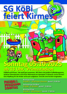 Fußball und Kirmes - das passt gut zusammen. Wir feiern mit großem Fußballprogramm, leckeren Flammkuchen und einem Weinstand am Sportplatz in Körprich unsere Kirmes! Eine Hüpfburg für die Kinder wird auch aufgebaut. Und alle sind herzlich eingeladen. Wann: Am 05.10.2025 ab 13:00 Uhr am Sportplatz in Körprich.