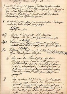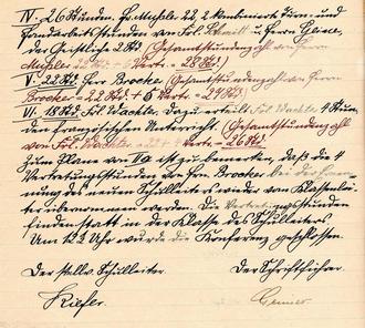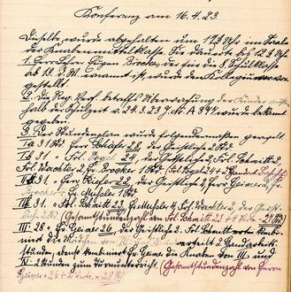 | I. | Unter Leitung des Herrn Rektors Schäfer wurde die Konferenz um 6.00eröffnet. Zuerst sprach er Herrn Oberlehrer Kiefer seinen und im Namen des ganzen Lehrkörpers Dank aus für die treue Verwaltung der Schulleiterstelle. |