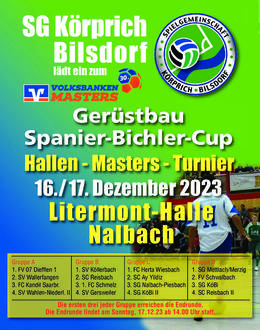 Das traditionelle Hallenturnier der SG Körprich-Bilsdorf findet am 16./17.12.23 in der Litermonthalle statt. Es ist uns wieder gelungen, ein hochklassiges Teilnehmerfeld aufzubieten, und mit 56 Wertungspunkten gehört unser Turnier mit zu den attraktivsten der aktuellen Qualifikation zum Finale des Hallenmasters in Saarbrücken am 28.01.24. Wir laden alle Fußballfreunde ein, sich unser Turnier nicht entgehen zu lassen.