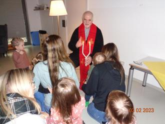 Am Freitag, den 03.02.2023 wird im kirchlichen Jahreskreis dem heiligen Bischof Blasius gedacht. Auch wir wollten an diesem Tag mit allen Kindern der Einrichtung dem heiligen Blasius gedenken und seinen Segen in der Kirche empfangen. Jedoch hat uns an diesem Tag der Regen einen Strich durch die Rechnung gemacht. So wurde kurzfristig alles umorganisiert und der Wortgottesdienst mit Pfarrer Plunien und der musikalischen Begleitung Frau Barth in die Kindergartenturnhalle verlegt.