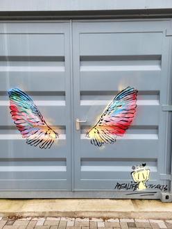Am zweiten Tag wurden erneut Gruppen eingeteilt. Ein Teil durfte am Container sprayen, ein Teil Skizzen zeichnen, ein Teil Malkartons ansprayen. Das Motiv am Container nahm immer mehr Gestalt an und so konnten wir nach einer leckeren Grill-Pause das Werk fertigstellen. Zusätzlich zu dem Piece wurden Flügel an den Container gesprüht, die in Zukunft als Foto- und Selfie-Spot genutzt werden können, wenn man an den neuen Sitzbänken am Container verweilt.