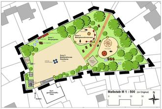 Der Entwurfsplan zum Kirmesplatz gliedert sich im Wesentlichen in vier Bereiche: