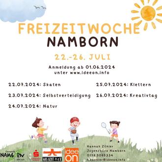 In diesem Jahr veranstaltet das Jugendbüro Namborn gemeinsam mit WasGeht?! e.V. und verschiedenen Vereinen und Anbietern aus der Gemeinde und dem Landkreis die “Namborner Freizeitwoche”.