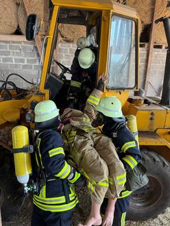 Eine weitere Person befand sich auf dem Heuboden und konnte mit Hilfe einer Schleifkorbtrage sicher aus dem Gefahrenbereich gebracht und erstversorgt werden.