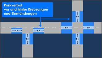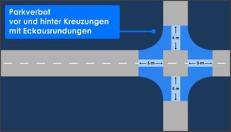 Parken ist vor und hinter Kreuzungen und Einmündungen bis zu je 5 m von den Schnittpunkten der Fahrbahnkanten verboten (§ 12 Absatz 3 Nummer 1 StVO).