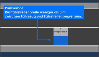 Du darfst auch nicht an den Stellen parken, bei denen zwischen deinem Fahrzeug und der Fahrstreifenbegrenzung (Zeichen 295) kein Fahrstreifen von mindestens 3 m mehr verbleibt (Anlage 2 laufende Nummer 68 StVO).