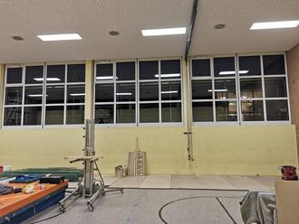 Aktuell sind alle Fenster, Lichtbänder der Turnhalle und des Speisesaales eingebaut.