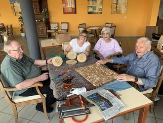 Während der letzten Männerrunde wurde auch der dritte Bilderrahmen fertiggestellt. Der Rahmen wurde erst geschliffen und gewachst, um diesen danach mit halbierten Korken als Pinnwand zu verwenden. Auch die ersten Baumscheiben, die ihre Mustervorlage durch Nägel erhielten, sind nun soweit um mit Wollfäden verziehrt zu werden. Bei dieser Arbeit schauten uns die ersten Frauen schon neugierig über die Schultern.