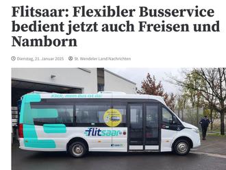 Der flexible Rufbus -Service „flitsaar“ dehnt seinen Einsatzgebiet im Landkreis St. Wendel weiter aus. Nach der erfolgreichen Einführung in der Kreisstadt. St. Wendel und im Ostertal können nun auch Bürger aus den Gemeinden Namborn und Freisen den Bedarfsverkehr nutzen. Der „flitsaar“ ergänzt das reguläre Busangebot am Wochenende und zu Randzeiten, wobei Fahrten ausschließlich nach vorheriger Bestellung durchgeführt werden.