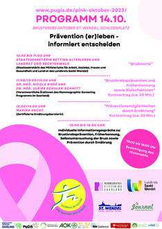St. Wendel (pdk). Im Oktober wird weltweit auf die Themen Brustkrebs, Brustkrebsprävention, Brustkrebsforschung und -behandlung hingewiesen. Daher veranstalten das Gesundheitsamt des Landkreises Sankt Wendel in Kooperation mit dem Netzwerk „Das Saarland lebt gesund!“ den Aktionstag „Prävention erleben - informiert entscheiden“: am Samstag, 14. Oktober, 10 bis 16 Uhr, Schlossplatz St. Wendel.