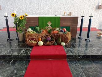 Zwar mit einer Woche verspätung, aufgrund der vielen Termine, wurde dennoch am Sonntag in unserer Kirche, für die beiden Kirchengemeinden Hofeld und Baltersweiler das Erntedankfest gefeiert. Vorm Altar war eine schöne Auswahl Früchte des Gartens und der Bäume präsentiert.