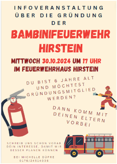 Auch die Feuerwehren haben es schwer mit der Mitgliedergewinnung. Dem entgegen zu wirken möchte unser Löschbezirk eine Bambinifeuerwehr gründen. Kindern zwischen 6 und 8 Jahren können dort den Einstieg in die Feuerwehr durch Spiel, Spass und Technik ermöglicht werden. Hierzu lädt der Löschbezirk Hirstein alle interessierten Kinder mit ihren Eltern zur Infoveranstaltung am 30.10 um 17 Uhr im Feuerwehrhaus ein. Darüber hinaus können Sie sich hier auch über die Jugendfeuerwehr oder den aktiven Dienst informieren. Zögern Sie nicht, denn Brandschutz geht uns alle an.