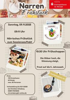 Herzliche Einladung des Furschweiler Karnevalvereins zum närrischen Frühstück am Sonntag, dem 09.11.2025 ab 09:11 Uhr.