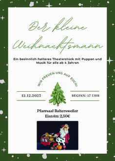 Weit, weit im Norden, wo der erste Schnee fällt, wenn bei uns noch Sommer ist, lebt ein kleiner Weihnachtsmann, der freut sich auf die Reise zu den Kindern wie kein anderer Weihnachtsmann auf der Welt. Doch da sind auch die großen Weihnachtsmänner, die meinen, dazu sei er noch zu klein. Ein besinnlich-heiteres Stück mit einem Spieler, Puppen und Musik für erwartungsvolle Zuschauer ab 4 Jahre, die für große Aufgaben nicht zu klein sind, auch wenn das mancher nicht wahr haben will. Nach dem gleichnamigen Kinderbuch von Anu Stohner und Henrike Wilson. Aufführungsrechte beim Rowohlt Theater Verlag, Hamburg.