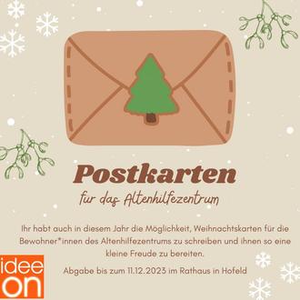 Abgeben könnt ihr die Postkarten bis zum 11.12.2023 im Rathaus. Diese werden dann gesammelt dem Altenhilfezentrum übergeben.
