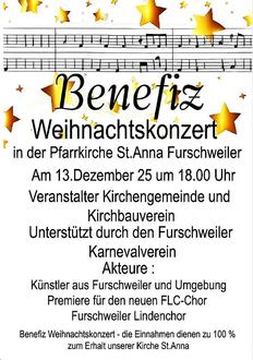 Am Samstag, dem 13.12.2025 veranstaltet der Kirchbauverein mit Unterstützung des Furschweiler Karnevalverein um 18:00 Uhr ein Benefizkonzert in der Pfarrkirche St. Anna Furschweiler. Es treten Sängerinnen und Sänger aus Furschweiler und Umgebung auf. Darüber hinaus wird es die Premiere für den im Frühjahr neu gegründeten FLC-Chor (Furschweiler Lindenchor) sein...