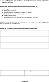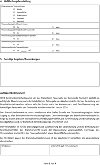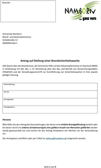 Gemäß §36 Gesetz über den Brandschutz, die Technische Hilfe und den Katastrophenschutz im Saarland (SBKG) in Verbindung mit §§1 Abs. 1, 41 Verordnung über den Bau und Betrieb von Versammlungsstätten (VStättVO) und der Verwaltungsvorschrift zur Durchführung von Sicherheitswachen in ihrer jeweils gültigen Fassung, ist bei Veranstaltungen, bei denen eine erhöhte Brandgefährdung besteht oder bei denen durch ein anderes Schadensereignis eine größere Anzahl von Menschen gefährdet werden würde, eine Brandsicherheitswache zu stellen. Den Antrag reichen sie bitte mindestens vier Wochen vor der Veranstaltung ein. Das Antragsformular ist auch unter folgendem Link auf der Homepage der Gemeinde Namborn zu finden: