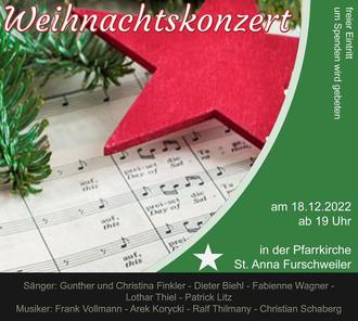 Am Sonntag, dem 18. Dezember 2022 findet um 19:00 Uhr in der Pfarrkirche St. Anna Furschweiler ein Weihnachtskonzert statt. Sänger sind: Gunter und Christina Finkler, Fabienne Wagner, Lothar Thiel, Dieter Biehl und Patrick Litz. Musiker sind Frank Vollmann, Arek Korycki, Ralf Thilmany und Christian Schaberg.
