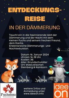 Taucht ein in die faszinierende Welt der Dämmerung und der Nacht mit dem kleinen Fuchs und seinem frechen Freund, dem Dachs! In einem geschützten Rahmen entdecken wir gemeinsam Themen wie Mut, Freundschaft und die Bedeutung von Angst als schützendes Gefühl vor Gefahren. Ein einzigartiges Abenteuer wartet auf die Kinder, bei dem sie nicht nur die Natur in der Dunkelheit kennenlernen, sondern auch wichtige Werte fürs Leben erfahren.