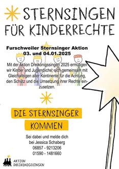 Am 03 und 04. Januar 2025 findet wieder eine Sternsingeraktion statt. Die Aktion steht unter dem Motto: „Erhebt euere Stimme! Sternsingen für Kinderrechte“.