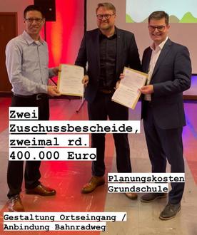 Besonders freuen konnten wir uns über gleich zwei Zuschussbescheide, die Staatssekretär Torsten Lang für Sötern mit im Gepäck hatte. Rund 400.000 Euro Zuschuss erhalten wir für die bereits geplante Neugestaltung des Ortseingangs aus Richtung Türkismühle, womit diese Maßnahme nun finanziert ist und umgesetzt werden kann. Hier soll der Radweg in diesem Bereich besser in das Verkehrsgeschehen integriert werden. Außerdem ist die Anlegung eines Kreisverkehrs vorgesehen, um die gefahrenen Geschwindigkeiten der Fahrzeuge dort zu reduzieren. Schließlich werden auch neue Parkplätze für Nutzer des Radwegs entstehen und ein Beachvolleyballfeld angelegt.