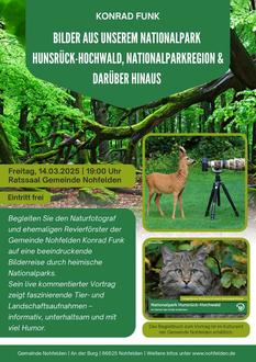 Die Gemeinde Nohfelden lädt am Freitag, den 14. März 2025 um 19:00 Uhr zu einem besonderen Bildervortrag in den Ratssaal der Gemeinde Nohfelden ein. Der erfahrene Naturfotograf und ehemalige Revierförster der Gemeinde Konrad Funk nimmt die Zuschauer mit auf eine faszinierende Reise durch die heimischen Naturlandschaften.