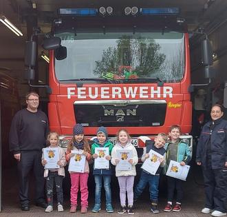 Aufgeregt und voller Freude machte sich die Wackelzähne auf den Weg zum Feuerwehrgerätehaus nach Nohfelden. Dort wurden wir schon von Daniel Gisch und Dorina Granzin erwartet. Daniel erklärte uns, wie man gutes von bösem Feuer unterscheidet, wie man Brandgefahren erkennt und wie man sich im Brandfall verhält. Auch das Absetzen eines Notrufes übten wir natürlich. Im Anschluss fand ein Rundgang durch das Feuerwehrgerätehaus statt. Hierbei durften wir uns die Schutzausrüstung, die Gerätschaften und natürlich die Feuerwehrautos näher ansehen. Ein Highlight neben dem " Sitzen" im Feuerwehrauto war das " Testen des Wasserschlauchs". Zum Abschluss erhielt jedes Kind eine tolle Urkunde.