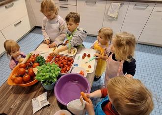 Seit einiger seit gibt es in unserer KiTa einen Mitmachkochtag. Dieser wird sehr gut angenommen und stößt auf große Resonanz. Doch wie kam es dazu...? Wir beantragten bei der Sarah Wiener Stiftung die Zertifizierung zur Genussbotschaftereinrichtung. Unsere Küchenfee Heike Rink ließ sich in einigen Seminaren zur Genußbotschafterin ausbilden. Dieses Projekt beinhaltet u.a. einen Förderzuschuss von 500 Euro seitens der Barmer. Grundidee des Ganzen ist es, die Kinder für gesundes, schmackhaftes Essen zu sensibilisieren. Lebensmittel werden mit allen Sinnen erlebt, gefühlt, verkostet und ihr Geruch intensiv wahrgenommen. Aus diesem Projekt heraus wurde die Idee des Mitmachkochtags geboren. Alle 14 Tage mittwochs findet dieser nun statt. Jede Gruppe bespricht im Wechsel mit den Kindern was es an diesem Tag in der KiTa zu essen geben soll. Partizipatorisch dürfen die Kinder entscheiden auf was sie Lust haben. Den Kindern gehört das alleinige Rederecht. Sie dürfen bei der Zubereitung helfen, erlernen bspw. den Umgang mit einem Messer (wie schneide ich richtig? was ist eine Messergarage...), wie bereite ich mich auf die Küchenarbeit vor.