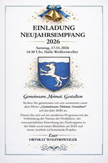 Am Samstag, dem 17.01.2026, lädt der Ortsrat Wolfersweiler unter dem Motto „Gemeinsam. Heimat. Gestalten.“ zum traditionellen Neujahrsempfang ein. Wir beginnen um 14:30 Uhr in der Mehrzweckhalle mit einem Sektempfang.