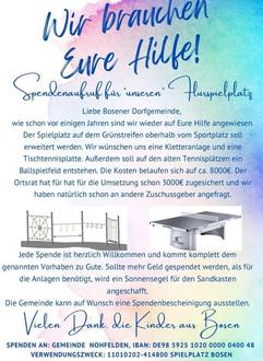 IBAN: DE 98 5925 1020 0000 0400 48 mit dem Verwendungszweck 11010202 – 414800 Spielplatz Bosen