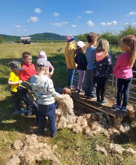 Am Montag dem 19.05. stand ein besonderes Ereignis an, der Besuch der Schäferei Benz in Mosberg. Jannes Oma und Opa besitzen dort eine große Schafherde und baten uns an, diese zu besuchen. Denn gerade im Frühling werden die "Lämmchen" geboren. Idyllisch abgelegen zwischen Walhausen und Mosberg fanden wir die Schafherde und erfuhren sogleich, dass in den nächsten Minuten die Geburt eines Lämmchens bevorstehe. Nachdem alle die Umgebung erkundet und auf den Traktor geklettert waren, sind wir auch schon los zur Schafherde. Tatsächlich fanden wir ein neu geborenes Lamm auf der Weide vor. Ganz wacklig versuchte es bereits seine ersten Schritte zu machen. Nach diesem faszinierenden Ereignis durften wir beim Schaf scheren zuschauen und die Wolle in die Hand nehmen und daran schnuppern. Rund um ein super toller Tag. Als kleine Erinnerung bekamen alle Kinder sehr leckere Schafkekse mit nach Hause.