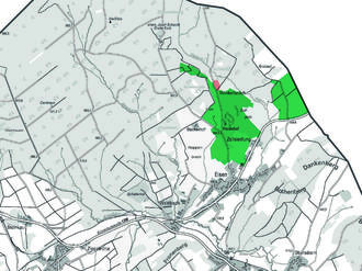 Geltungsbereich des Bebauungsplanes „2. Erweiterung Golfpark Bostalsee“ und der Teiländerung des Flächennutzungsplans in der Gemeinde Nohfelden, Ortsteil Eisen (rot unterlegt; grün = Bestand)