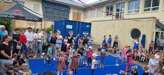 Am 01.06.25 fand in Selbach das traditionelle Dorffest statt. Dabei trat die Tanzgruppe der KiTa mit ihrem Superheldensong auf. Der Auftritt war wirklich große Klasse und machte allen Kindern sichtlich Spaß. Nach einer Zugabe des Auftritts gab es für jedes Kind eine kleine Tüte Chips als Dank.