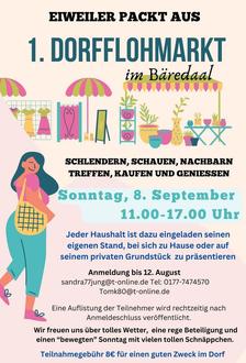 Am Sonntag. dem 08. September 2024 von 11.00- 17.00 Uhr ist jeder Haushalt aus Eiweiler dazu eingeladen seinen eigenen Stand im Hof, Vorgarten oder Garage zu präsentieren. Es darf alles angeboten werden von Kinderspielzeug, Kleidung, Haushaltswaren bis Gartenzubehör und Bücher.